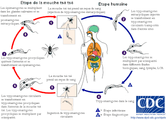 La mouche tsé-tsé est grande, brune et furtive. La piqûre est ressentie comme une aiguille chaude enfoncée dans la chair. Pendant un repas de sang sur le mammifère hôte, une mouche tsé-tsé infectée (du genre Glossina) injecte les trypomastigotes métacycliques dans le tissu cutané. Les parasites entrent dans le système lymphatique et passent dans la circulation sanguine (1). À l'intérieur de l’hôte, ils se transforment en trypomastigotes circulants dans le sang (2) et sont transportés à d'autres emplacements dans tout le corps, atteignent d'autres fluides biologiques (par exemple, lymphe, liquide cérébrospinal), et continuent de se répliquer par scissiparité (3). Le cycle parasitaire du Trypanosome africain est représenté par des étapes extracellulaires. Une mouche tsé-tsé s’infecte par des trypomastigotes circulants en prenant un repas de sang sur un mammifère infecté hôte (4)(5). Dans l’intestin de la mouche, les parasites se transforment en trypomastigotes procycliques, se multiplient par scissiparité (6), quittent l’intestin, et se transforment en épimastigotes (7). Les épimastigotes atteignent les glandes salivaires de la mouche et continuent leur multiplication par scissiparité (8). Le cycle dans la mouche dure approximativement 3 semaines.