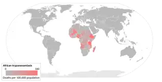 - ↑ (en) Fact sheet No 259: African trypanosomiasis or sleeping sickness, (lire en ligne)