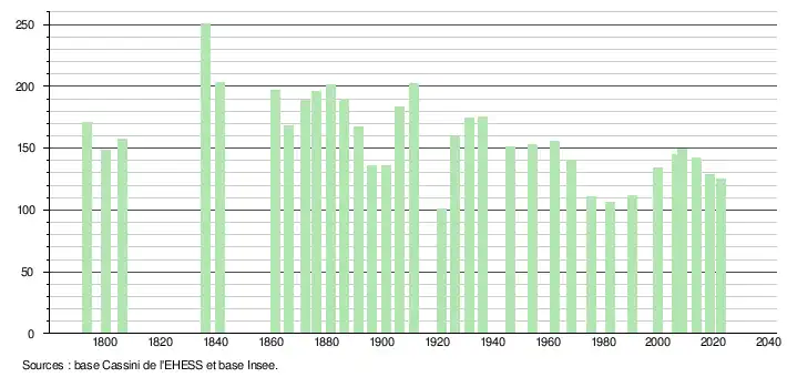 - ↑ Population municipale de référence en vigueur au 1er janvier 2025, millésimée 2022, définie dans les limites territoriales en vigueur au 1er janvier 2024, date de référence statistique : 1er janvier 2022.