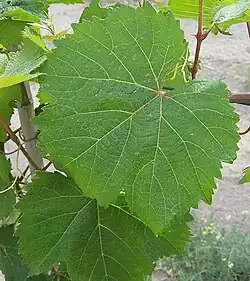 - Feuilles adultes entières ou trilobées, avec un sinus pétiolaire ouvert en U ou en V, des dents longues et fines, un limbe révoluté ondulé entre les nervures, dessous du limbe aranéeux.
