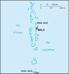 Les Maldives, en forme longue la république des Maldives[6] (en maldivien : ދިވެހިރާއްޖޭގެ ޖުމްހޫރިއްޔާ, Dhivehi Raa'jeyge Jumhooriyya), sont un pays d'Asie du Sud composé de 1 199 îles, dont 202 habitées, situé au sud-ouest du sous-continent indien. Une distance de 608 km sépare Malé, la capitale, de Thiruvananthapuram en Inde. La superficie des terres émergées est de 298 km2 sur les 21 372,72 km2 de superficie totale du pays, lagons inclus[7].