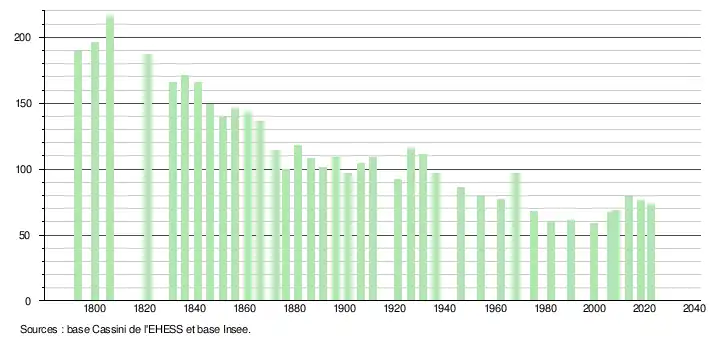 L'évolution du nombre d'habitants est connue à travers les recensements de la population effectués dans la commune depuis 1793. Pour les communes de moins de 10 000 habitants, une enquête de recensement portant sur toute la population est réalisée tous les cinq ans, les populations de référence des années intermédiaires étant quant à elles estimées par interpolation ou extrapolation[25]. Pour la commune, le premier recensement exhaustif entrant dans le cadre du nouveau dispositif a été réalisé en 2008[26].