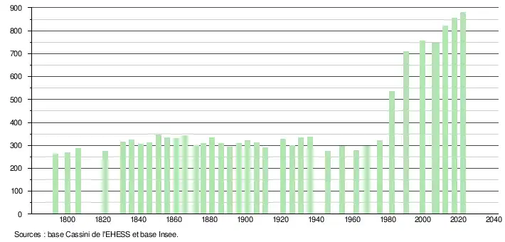L'évolution du nombre d'habitants est connue à travers les recensements de la population effectués dans la commune depuis 1793. Pour les communes de moins de 10 000 habitants, une enquête de recensement portant sur toute la population est réalisée tous les cinq ans, les populations de référence des années intermédiaires étant quant à elles estimées par interpolation ou extrapolation[24]. Pour la commune, le premier recensement exhaustif entrant dans le cadre du nouveau dispositif a été réalisé en 2007[25].