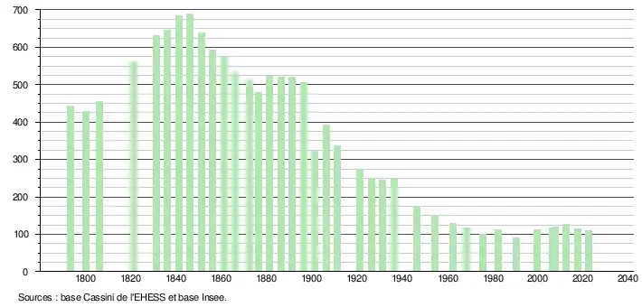 L'évolution du nombre d'habitants est connue à travers les recensements de la population effectués dans la commune depuis 1793. Pour les communes de moins de 10 000 habitants, une enquête de recensement portant sur toute la population est réalisée tous les cinq ans, les populations de référence des années intermédiaires étant quant à elles estimées par interpolation ou extrapolation[30]. Pour la commune, le premier recensement exhaustif entrant dans le cadre du nouveau dispositif a été réalisé en 2007[31].