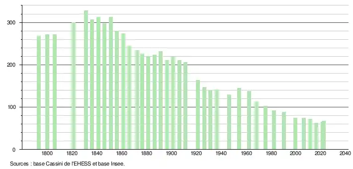 L'évolution du nombre d'habitants est connue à travers les recensements de la population effectués dans la commune depuis 1793. Pour les communes de moins de 10 000 habitants, une enquête de recensement portant sur toute la population est réalisée tous les cinq ans, les populations de référence des années intermédiaires étant quant à elles estimées par interpolation ou extrapolation[20]. Pour la commune, le premier recensement exhaustif entrant dans le cadre du nouveau dispositif a été réalisé en 2006[21].