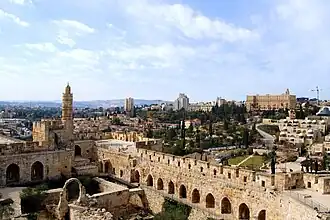 La rue de Jaffa s'agrémente d'arbres (aux plants venus de Jericho), et des premiers éclairages et poubelles publics. Une grande horloge baroque (1901)[34] - que les Britanniques retireront en 1924 - en l'honneur du sultan Abdul Hamid II[N 8] et un théâtre municipal se plantent, l'un au-dessus et l'autre en face de la porte de Jaffa[20]. Pour y mieux accueillir les touristes et les pèlerins dont la venue s'est intensifiée à partir des années 1880[11] grâce à l'incitation touristique, le centre YMCA et les luxueux hôtels Palace et King David voient concomitamment le jour au tout début des années 1930, ainsi qu'une zone commerciale plus structurée à l'extérieur de la porte de Jaffa, près de laquelle s'installent aussi d'autres services touristiques pour le gîte et les circuits de visite, et des boutiques de souvenirs de la ville sainte.