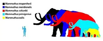 - Mammuthus exilis, vivant vers - 35 000 ans, espèce insulaire naine des îles de Californie.