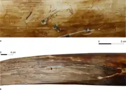 - ↑ (en) M. Mussi et P. Villa, « Single carcass of Mammuthus primigenius with lithic artifacts in the Upper Pleistocene of northern Italy », Journal of Archaeological Science, vol. 35, no 9, , p. 2606–2613 (DOI 10.1016/j.jas.2008.04.014)