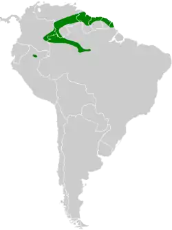 Cet oiseau vit au Brésil, en Colombie, en Guyane française, au Guyana, au Suriname, au Venezuela et aussi dans le nord du Pérou.