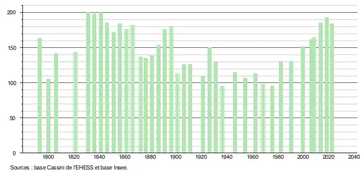 L'évolution du nombre d'habitants est connue à travers les recensements de la population effectués dans la commune depuis 1793. Pour les communes de moins de 10 000 habitants, une enquête de recensement portant sur toute la population est réalisée tous les cinq ans, les populations de référence des années intermédiaires étant quant à elles estimées par interpolation ou extrapolation[17]. Pour la commune, le premier recensement exhaustif entrant dans le cadre du nouveau dispositif a été réalisé en 2008[18].