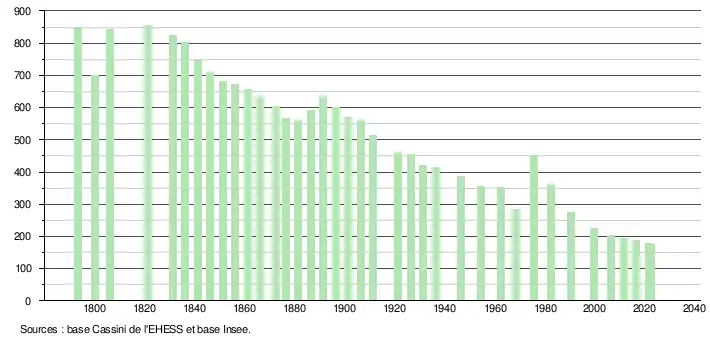 L'évolution du nombre d'habitants est connue à travers les recensements de la population effectués dans la commune depuis 1793. Pour les communes de moins de 10 000 habitants, une enquête de recensement portant sur toute la population est réalisée tous les cinq ans, les populations de référence des années intermédiaires étant quant à elles estimées par interpolation ou extrapolation[18]. Pour la commune, le premier recensement exhaustif entrant dans le cadre du nouveau dispositif a été réalisé en 2006[19].