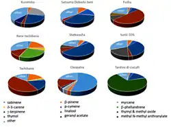 4 profils singuliers sont non compris: 'Tachibana' (limonène/γ-terpinène + δ-3-carène et un α-phellandrène), 'Korai tachibana' (limonène + δ-3-carène et un 5 % de β--phellandrène), 'Ben di gang ju' et 'Kunembo' (30 % de myrcène) et 'Shikuwasa' (peu de limonène + 24 % d'γ-terpinène et 9 % de p-cymène et spécifique carvone et γ-cadinène)[3].