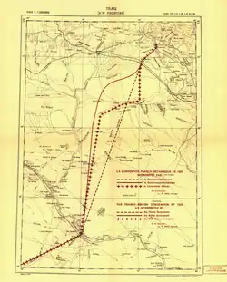 La convention du 23 décembre 1920 délimitant les pays sous mandat français des pays sous mandat britannique s’en est tenue à un tracé étudié à Londres en février-mars 1920. La frontière syro-palestinienne actuelle part de Ras el-Nakoura au même point que la ligne Sykes-Picot, qu’elle quitte pour laisser à l’État sioniste toute la vallée du Jourdain sur les deux rives du fleuve, du nord de la mer de Tibériade jusqu’à la latitude de Tyr ; après avoir traversé cette mer du nord au sud, elle rejoint, au-delà du chemin de fer du Hedjaz, la frontière de 1920. Ainsi, la convention de 1920 par rapport aux accords de 1916 agrandit la Palestine aux dépens de la Syrie. Le foyer juif dessine dans le mandat français une grande entaille profonde de 40 à 45 kilomètres en direction de Damas[27].