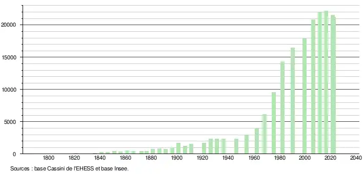 - ↑ Par convention dans Wikipédia, le principe a été retenu de n’afficher dans le tableau des recensements et le graphique, pour les populations de référence postérieures à 1999, que les populations correspondant à une enquête exhaustive de recensement pour les communes de moins de 10 000 habitants, et que les populations des années 2006, 2011, 2016, etc. pour les communes de plus de 10 000 habitants, ainsi que la dernière population de référence publiée par l’Insee pour l'ensemble des communes.