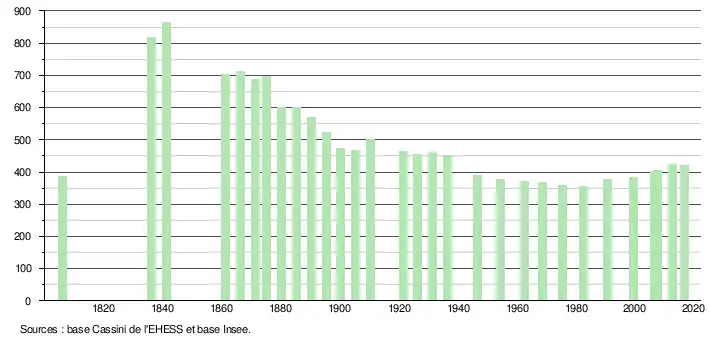 L'évolution du nombre d'habitants est connue à travers les recensements de la population effectués dans la commune depuis 1806. Pour les communes de moins de 10 000 habitants, une enquête de recensement portant sur toute la population est réalisée tous les cinq ans, les populations de référence des années intermédiaires étant quant à elles estimées par interpolation ou extrapolation[8]. Pour la commune, le premier recensement exhaustif entrant dans le cadre du nouveau dispositif a été réalisé en 2007[9].