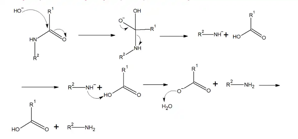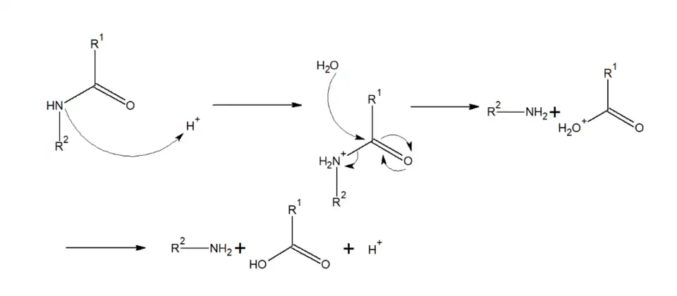 Son hydrolyse peut se réaliser en milieu acide ou basique. L’hydrolyse acide implique l’attaque de l’atome d’azote de la fonction amide via le doublet non liant pour capter un proton (réaction acide/base), afin d'accroître l’électrophilicité du carbone. L’eau joue ensuite le rôle de nucléophile en attaquant le carbone de l’amide pour former un acide carboxylique et une amine. (figure 3)