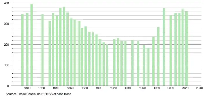 L'évolution du nombre d'habitants est connue à travers les recensements de la population effectués dans la commune depuis 1793. Pour les communes de moins de 10 000 habitants, une enquête de recensement portant sur toute la population est réalisée tous les cinq ans, les populations de référence des années intermédiaires étant quant à elles estimées par interpolation ou extrapolation[18]. Pour la commune, le premier recensement exhaustif entrant dans le cadre du nouveau dispositif a été réalisé en 2006[19].