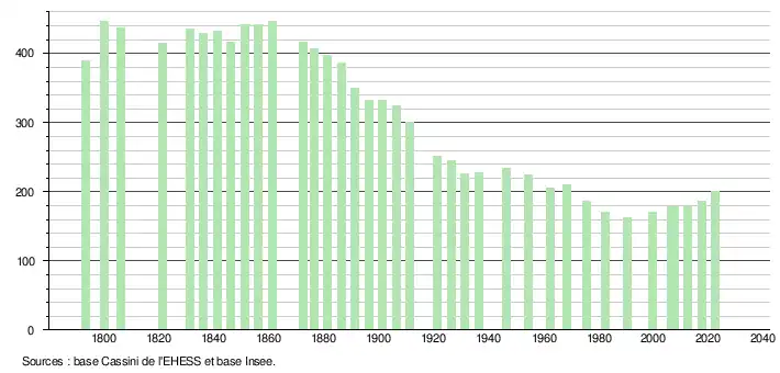 L'évolution du nombre d'habitants est connue à travers les recensements de la population effectués dans la commune depuis 1793. Pour les communes de moins de 10 000 habitants, une enquête de recensement portant sur toute la population est réalisée tous les cinq ans, les populations de référence des années intermédiaires étant quant à elles estimées par interpolation ou extrapolation[25]. Pour la commune, le premier recensement exhaustif entrant dans le cadre du nouveau dispositif a été réalisé en 2007[26].