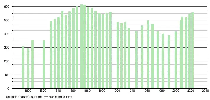 L'évolution du nombre d'habitants est connue à travers les recensements de la population effectués dans la commune depuis 1793. Pour les communes de moins de 10 000 habitants, une enquête de recensement portant sur toute la population est réalisée tous les cinq ans, les populations de référence des années intermédiaires étant quant à elles estimées par interpolation ou extrapolation[16]. Pour la commune, le premier recensement exhaustif entrant dans le cadre du nouveau dispositif a été réalisé en 2008[17].