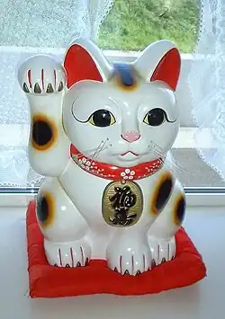 Le maneki-neko (招き猫, « chat qui invite »), est une figurine représentant un chat, assis, levant une ou deux pattes, en guise de salutation. Issu des traditions populaires japonaises dans lesquelles les chats étaient estimés grâce à leur efficacité dans la lutte contre les rongeurs, cet okimono (置物 ; « bibelot »), généralement en céramique, en porcelaine ou même en plastique, est considéré comme un porte-bonheur associés à la prospérité commerciale. On le trouve devant de nombreux magasins et restaurants, mais aussi dans les foyers où il se décline en de nombreux autres objets comme des de tirelires ou des porte-clés, devenant un objet emblématique de la culture japonaise contemporaine.