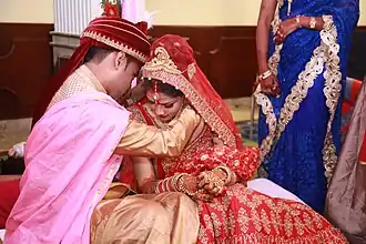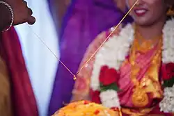 Mangala sutra signifie littéralement « une chaîne de bon augure » [4] qui est noué autour du cou de la mariée et qu'elle porte pour le reste de son mariage. Il s'agit généralement d'un collier de perles noires enfilées à partir d'un fil noir ou jaune préparé avec du curcuma. Parfois, des perles dorées, blanches ou rouges sont également ajoutées au mangalsutra, selon les régions. C'est un symbole du mariage porté par les femmes. L’idée du fil sacré existe depuis des siècles, remontant même à la période Sangam. Mais la nature de ces chaînes de bon augure a évolué au fil du temps et varie considérablement selon les différentes communautés. Les groupes religieux non hindous tels que les chrétiens syriens portent également le mangalsutra, mais avec une croix dessus. Il existe de nombreuses communautés en Inde, parmi lesquelles le mangalsutra semble absent, et d'autres formes de signes matrimoniaux ont pris leur place. Par exemple, dans une grande partie du nord de l’Inde, la bague d’orteil et les bracelets en verre indiquent l’état civil d’une femme.