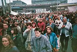 La manifestation d'Alexanderplatz[1],[2] (en allemand : Alexanderplatz-Demonstration) est une manifestation en faveur de réformes politiques dirigée contre le gouvernement de la République démocratique allemande qui se déroule sur l'Alexanderplatz à Berlin-Est le samedi 4 novembre 1989. Avec entre un demi-million et un million de manifestants, c'est la plus grande manifestation de l'histoire de l'Allemagne de l'Est[3] et une étape décisive de la révolution pacifique qui a conduit à la chute du mur de Berlin et à la réunification allemande. La manifestation est organisée par des acteurs et des employés de théâtres de Berlin-Est. Il s'agit de la première manifestation de l'histoire de l'Allemagne de l'Est organisée par des particuliers et autorisée par les autorités. Les orateurs lors de la manifestation sont des membres de l'opposition, des représentants du régime et des artistes, et aussi les dissidents Marianne Birthler et Jens Reich, les écrivains Stefan Heym et Christa Wolf, l'acteur Ulrich Mühe, l'ancien chef du service de renseignement extérieur est-allemand Markus Wolf et Günter Schabowski, membre du Politbüro du SED.