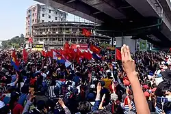 Le , 100 000 manifestants à Minbu (en), représentant une coalition diversifiée d'hindous, de musulmans, d'ouvriers des champs pétrolifères et de fonctionnaires, se sont rassemblés pour protester leur opposition au coup d'État et soutenir la libération de politiciens élus par les civils.