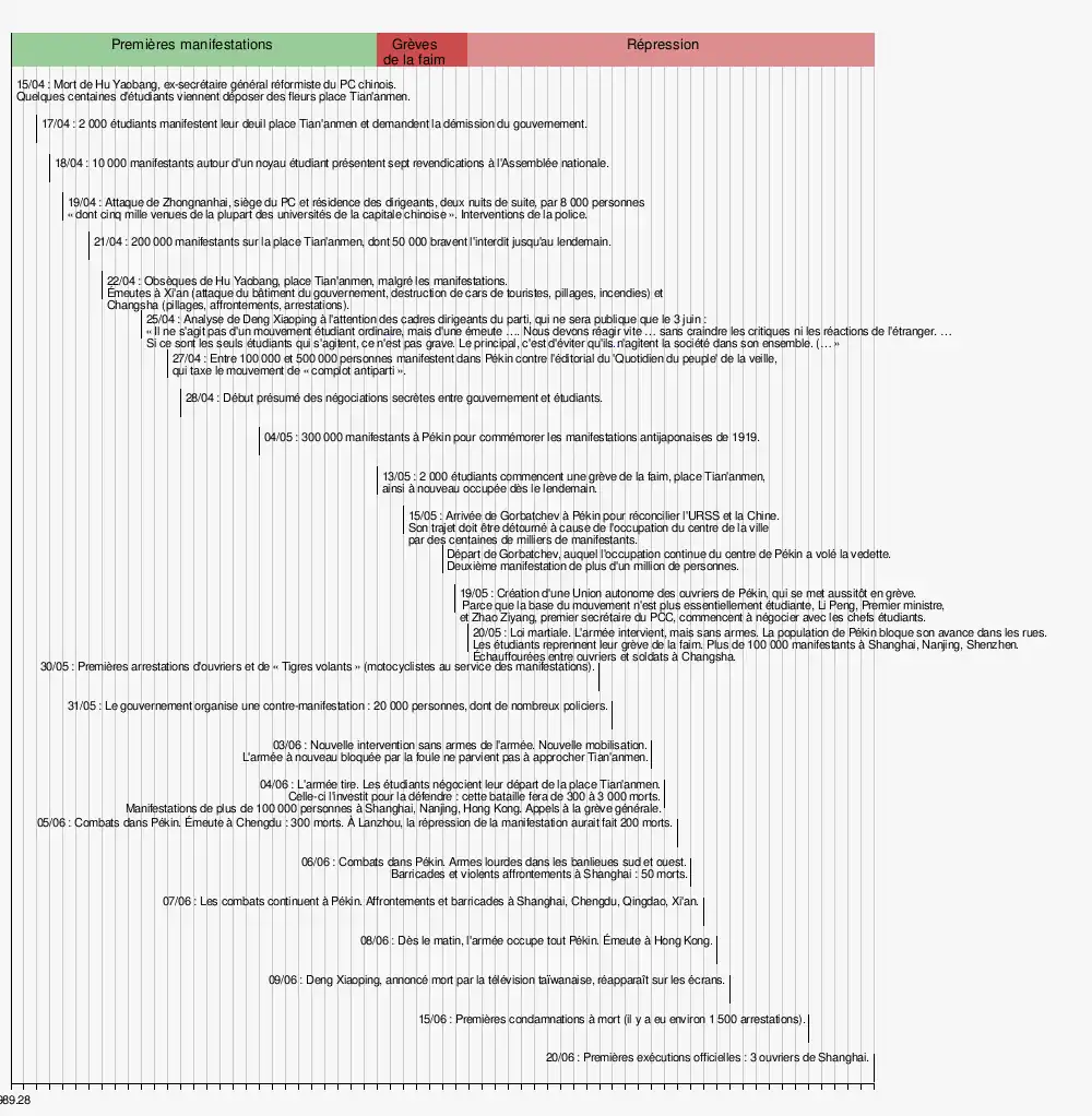 Cet événement politique, le plus important de l'après-révolution culturelle, prit la forme d’un mouvement d'étudiants, d'intellectuels et d'ouvriers chinois, qui dénoncent la corruption et demandent des réformes politiques et démocratiques. La contestation s'étend à la plupart des grandes villes, comme Shanghai, et aboutit à Pékin à une série de grandes manifestations et de grèves de la faim organisées sur la place Tian'anmen. Après plusieurs tentatives de négociation, le gouvernement chinois instaure la loi martiale le et fait intervenir l'armée le .