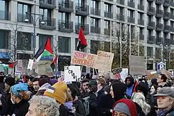 Dans certains pays européens, le soutien public à la Palestine et à la cause palestinienne est criminalisé, des pays comme la France, l'Allemagne, le Royaume-Uni et la Hongrie limitant le discours politique pro-palestinien[4]. L'Allemagne a interdit les collectes de fonds, l'affichage du drapeau palestinien et le port du keffieh[5]. Le conflit a également déclenché de vastes manifestations auprès des ambassades israéliennes et américaines à travers le monde[6].