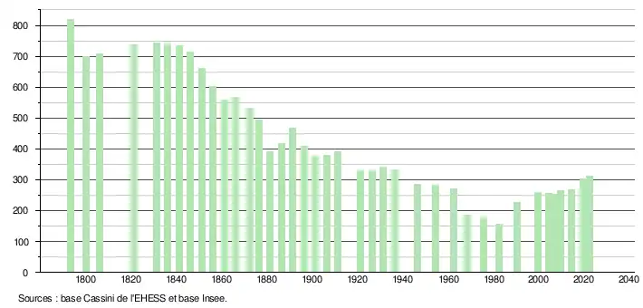 L'évolution du nombre d'habitants est connue à travers les recensements de la population effectués dans la commune depuis 1793. Pour les communes de moins de 10 000 habitants, une enquête de recensement portant sur toute la population est réalisée tous les cinq ans, les populations de référence des années intermédiaires étant quant à elles estimées par interpolation ou extrapolation[25]. Pour la commune, le premier recensement exhaustif entrant dans le cadre du nouveau dispositif a été réalisé en 2004[26].