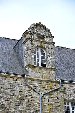 La seconde partie du logis, à l'est, est marquée par une lucarne à fronton circulaire portant une coquille Saint-Jacques et renfermant une baie plein cintre ornée de pilastres. Une tour d'escalier hexagonale termine ce logis à l'est. Elle s'ouvre sur la cour dans son pan occidental par une porte ornée de pilastres. Les deux baies du premier étage, s'appuyant sur une corniche, comportent également une ornementation à pilastres.