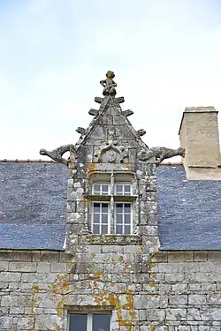 Le manoir de Kergal s'organise autour d'un cour orientée au sud dans laquelle sont conservés les restes d'un four à pain, quelques communs et un corps de logis bâti sur trois niveaux. Ce corps de logis est en réalité la combinaison de deux bâtiments accolés construits à la suite l'une de l'autre. Le premier, à l'ouest, se distingue par la conservation d'une fenêtre à meneaux et d'une lucarne à gâble et crossettes, portant personnage, animaux et les armes des Daniélo[21]. Une autre lucarne similaire, qui se trouvait plus à l'ouest, a disparu au début du XXe siècle. Cette partie du corps de logis s'ouvre vers la cour par une porte en anse de panier. La circulation au sein de cet édifice est assurée par la présence d'une tour d'escalier circulaire à l'arrière du bâtiment. D'importantes cheminées et des coussièges y sont conservés.