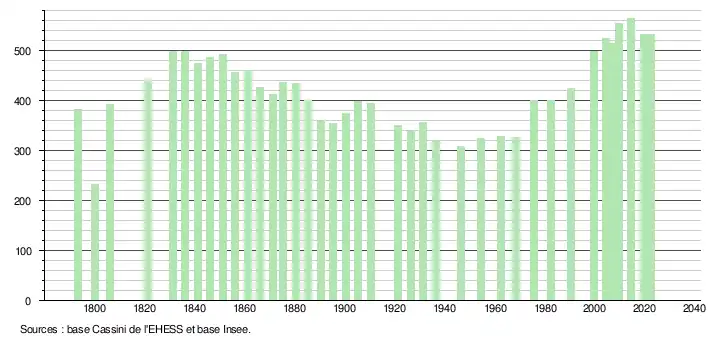 L'évolution du nombre d'habitants est connue à travers les recensements de la population effectués dans la commune depuis 1793. Pour les communes de moins de 10 000 habitants, une enquête de recensement portant sur toute la population est réalisée tous les cinq ans, les populations de référence des années intermédiaires étant quant à elles estimées par interpolation ou extrapolation[23]. Pour la commune, le premier recensement exhaustif entrant dans le cadre du nouveau dispositif a été réalisé en 2004[24].