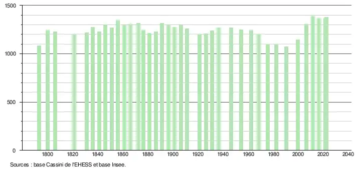 L'évolution du nombre d'habitants est connue à travers les recensements de la population effectués dans la commune depuis 1793. Pour les communes de moins de 10 000 habitants, une enquête de recensement portant sur toute la population est réalisée tous les cinq ans, les populations de référence des années intermédiaires étant quant à elles estimées par interpolation ou extrapolation[28]. Pour la commune, le premier recensement exhaustif entrant dans le cadre du nouveau dispositif a été réalisé en 2006[29].