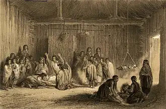 Les migrations de peuples autochtones, notamment celles des peuples mapuche et Tehuelche, étaient motivées en grande partie par le commerce, tant avec d’autres autochtones qu’avec les criollos. Il arrivait que des peuples différents se disputent la maîtrise des principales routes commerciales, mais le processus de « mapuchisation » a pour origine, dès avant le milieu du XVIIIe siècle, le fait totalement pacifique que des foires se tenaient à El Cayrú et à Chapaleofú, dans les montagnes de la pampa humide (actuelle Argentine), lieux d’une très importante activité commerciale et d’échange de produits entre les habitants des plaines pampéennes et des montagnes de l’actuelle province de Buenos Aires, ceux de la Patagonie septentrionale et ceux des deux versants de la cordillère des Andes. Lors des foires d’El Cayrú et de Chapaleofú (appelées « ferias de los ponchos » par les jésuites de l’époque qui les ont consignées, comme p.ex. Thomas Falkner) s’échangeaient divers types de marchandises, allant de produits de l’élevage et de l’agriculture aux produits vestimentaires, tels que les ponchos. El Cayrú se trouvait dans la partie la plus occidentale du Système de Tandilia (sur le territoire de l’actuel partido d’Olavarría), tandis que Chapaleofú fait référence à la zone le long de la rivière homonyme coulant dans l’actuel partido de Tandil[64]. Ainsi se produisit-il, dès le milieu du XVIIIe siècle et parallèlement à ces mouvements de personnes dans le cadre des échanges de marchandises, une certaine interpénétration culturelle entre différents peuples habitant des territoires s’étendant de la pampa humide jusqu’à la zone bordant la cordillère des Andes (sur son versant tant oriental qu’occidental) et jusqu’au littoral pacifique, en passant par la Patagonie septentrionale. Ces déplacements seront l’amorce de l’échange culturel et de mouvements migratoires entre les différents peuples, dont en particulier les Tehuelches, les Ranquels et les Mapuches[65]. Cette influence mapuche, commerciale à l’origine, puis reposant sur des alliances, finit par exercer un fort impact culturel sur les Tehuelches et d’autres peuples, et donnera lieu à qu’on la nomme aujourd’hui « mapuchisation » ou « araucanisation » des Pampas et de la Patagonie. Une bonne part des Tehuelches allaient faire siennes tout un ensemble de coutumes des Mapuches, de même aussi que leur langue, pendant que les Mapuches pour leur part allaient adopter pour partie le mode de vie Tehuelche (comme p.ex. s’abriter dans des tolderías, campements de tentes), par suite de quoi les différences entre les deux groupes s’estomperont progressivement, à telle enseigne que leurs descendants s’appellent eux-mêmes aujourd’hui Mapuche-Tehuelches[66]. L’araucanisation, c’est-à-dire l’assimilation et le métissage par les Mapuches des peuples vivant à l’est des Andes, fut un processus complexe et graduel, s’étendant sur plusieurs générations[67].