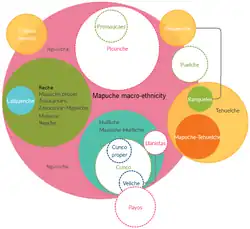 Quelques études contemporaines répartissent les autochtones de langue mapuche en plusieurs groupes selon le territoire qu’ils occupent et sur la base de certaines différences culturelles dérivées de cette localisation. Néanmoins, pour l’ensemble des chercheurs, tous sont Mapuches, et ne se différencient plus guère, ainsi qu’il appert de la liste ci-dessous, que par le lieu géographique où ils sont établis. Les dénominations assignées à ces groupes sont déictiques et s’entendent par rapport au point de référence que sont les Mapuches d’Araucanie :