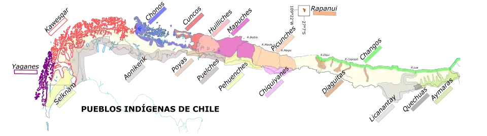 • Picunches (gens du nord) : établis entre les fleuves Choapa et Maule (territoire ayant pour nom Pikun Mapu). Une partie de ce groupe, les Promaucaes (es), s’était autrefois pacifiquement mélangé à l’Empire inca[57]. Leur principale activité économique était l’agriculture, pratiquée selon un système d’agriculture itinérante. Ils s’adonnaient en outre à l’élevage de lamas et connaissaient la poterie en grès. Ils se constituèrent comme peuple par acculturation et métissage avec les colonisateurs espagnols ; de ce mélange est issue la majeure partie de la population qui habite la zone centrale du Chili. D’autres groupes identifiés par les Espagnols, en plus des Promaucaes, étaient les Mapochoes, les Maules et les Cauquenes.
