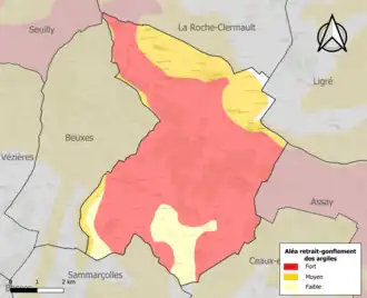 La commune est vulnérable au risque de mouvements de terrains constitué principalement du retrait-gonflement des sols argileux[18]. Cet aléa est susceptible d'engendrer des dommages importants aux bâtiments en cas d’alternance de périodes de sécheresse et de pluie. 90,2 % de la superficie communale est en aléa moyen ou fort (90,2 % au niveau départemental et 48,5 % au niveau national). Sur les 276 bâtiments dénombrés sur la commune en 2019, 250 sont en aléa moyen ou fort, soit 91 %, à comparer aux 91 % au niveau départemental et 54 % au niveau national. Une cartographie de l'exposition du territoire national au retrait gonflement des sols argileux est disponible sur le site du BRGM[19],[20].
