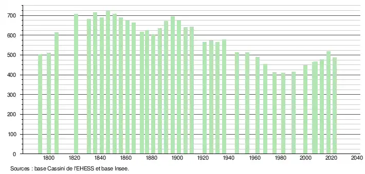 L'évolution du nombre d'habitants est connue à travers les recensements de la population effectués dans la commune depuis 1793. Pour les communes de moins de 10 000 habitants, une enquête de recensement portant sur toute la population est réalisée tous les cinq ans, les populations de référence des années intermédiaires étant quant à elles estimées par interpolation ou extrapolation[22]. Pour la commune, le premier recensement exhaustif entrant dans le cadre du nouveau dispositif a été réalisé en 2007[23].