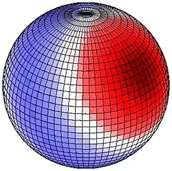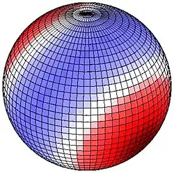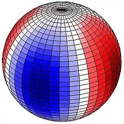 La marée semi-diurne (un maximum toutes les 12 heures environ) est principalement lunaire (seul S 2 est purement solaire) et donne lieu à des déformations sectorielles qui montent et descendent en même temps le long de la même longitude[16]. Les variations sectorielles des déplacements verticaux et est-ouest sont maximales à l'équateur et disparaissent aux pôles. Il y a deux cycles le long de chaque latitude, les renflements opposés et les dépressions également opposées. La marée diurne est lunisolaire et donne lieu à des déformations tessérales. Le mouvement vertical et est-ouest est maximal à 45° de latitude et nul à l'équateur et aux pôles. La variation tessérale a un cycle par latitude, un renflement et une dépression ; les renflements sont opposés (antipodaux), c'est-à-dire que la partie ouest de l'hémisphère nord et la partie est de l'hémisphère sud, par exemple, et de même les dépressions s'opposent, la partie est de l'hémisphère nord et la partie ouest de l'hémisphère sud, dans ce cas. Enfin, les marées bimensuelles et semi-annuelles ont des déformations zonales (constantes le long d'un cercle de latitude), car la gravitation de la Lune ou celle du Soleil est dirigée alternativement loin des hémisphères nord et sud en raison de l'inclinaison. Il n'y a aucun déplacement vertical à 35° 16' de latitude.