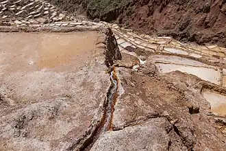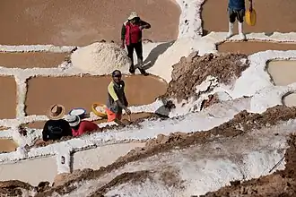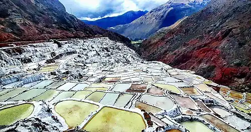 La ville a surtout survécu, semble-t-il, grâce à ses salines, situées à près d'une heure de marche de là, sur un versant escarpé. À cet endroit, le plateau commence à plonger vers la Vallée sacrée. A plus de 3 200 m, une source jaillit donnant naissance à un ruisseau saturé de chlorure de sodium. Un atout précieux dans cette région très éloignée de la mer. Aujourd'hui, les 700 à 800 familles qui possèdent les quelque 3 600 bassins sont organisées en coopérative. La production annuelle totale oscille entre 160 et 200 tonnes.
