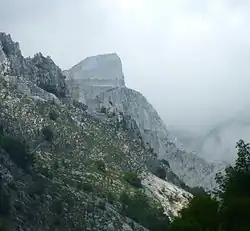 Sommet découpé et exploité en carrière à ciel ouvert.
