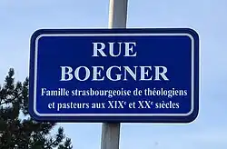 - Le nom d'une rue de Strasbourg, dans le quartier de la Robertsau, rend hommage à la famille Boegner.