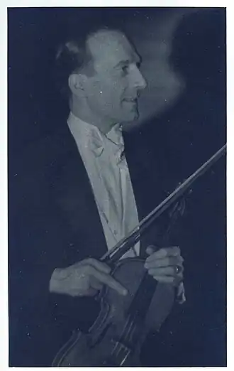 Marcel Reynal, mai 1937, Paris, Théâtre des Champs-Elysées, lors de la tournée des Ballets russes à l'occasion de l'Exposition universelle ; il tient en main son Stradivarius.