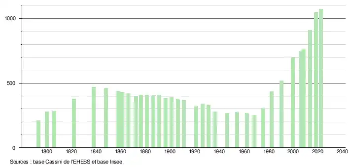 L'évolution du nombre d'habitants est connue à travers les recensements de la population effectués dans la commune depuis 1793. Pour les communes de moins de 10 000 habitants, une enquête de recensement portant sur toute la population est réalisée tous les cinq ans, les populations de référence des années intermédiaires étant quant à elles estimées par interpolation ou extrapolation[14]. Pour la commune, le premier recensement exhaustif entrant dans le cadre du nouveau dispositif a été réalisé en 2008[15].
