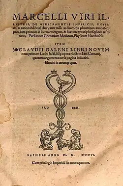 - Plus récemment, le texte a été édité par Georg Helmreich (de), à Leipzig, chez Teubner, en 1889, puis par Maximilian Niedermann, pour la même maison, en 1916. Maximilian Niedermann et Eduard Liechtenhan (éd.), Marcelli De medicamentis liber, Corpus Medicorum Latinorum, V, Berlin, Academie-Verlag, 1968.