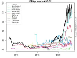 Après avoir testé depuis 2013 des marchés locaux dans sept de ses plus grandes villes (Pékin, Shanghai, la province de Canton, Chongqing…) avec l'objectif d'instaurer un système national d'ici à 2017, la Chine annonce le 1er février 2021 l'entrée en vigueur du marché national du carbone chinois, inspiré du système d'échanges de quotas d'émissions de l'Union européenne[23].