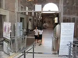 Au premier étage, le mur est percé d'une série de fenêtres voûtées (à raison de cinq fenêtres pour trois boutiques du rez-de-chaussée) entourées de piliers de briques avec bases et chapiteaux et surmontées de petits frontons. Elles s'ouvrent sur un couloir voûté passant au-dessus des boutiques qui dessert à l'intérieur dix autres boutiques. Il s'étend vers le nord, conduisant à un autre couloir flanqué d'un groupe de boutiques.
