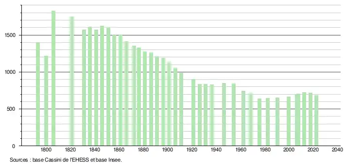 L'évolution du nombre d'habitants est connue à travers les recensements de la population effectués dans la commune depuis 1793. Pour les communes de moins de 10 000 habitants, une enquête de recensement portant sur toute la population est réalisée tous les cinq ans, les populations de référence des années intermédiaires étant quant à elles estimées par interpolation ou extrapolation[36]. Pour la commune, le premier recensement exhaustif entrant dans le cadre du nouveau dispositif a été réalisé en 2007[37].