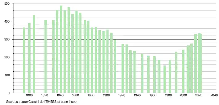 L'évolution du nombre d'habitants est connue à travers les recensements de la population effectués dans la commune depuis 1793. Pour les communes de moins de 10 000 habitants, une enquête de recensement portant sur toute la population est réalisée tous les cinq ans, les populations de référence des années intermédiaires étant quant à elles estimées par interpolation ou extrapolation[10]. Pour la commune, le premier recensement exhaustif entrant dans le cadre du nouveau dispositif a été réalisé en 2005[11].